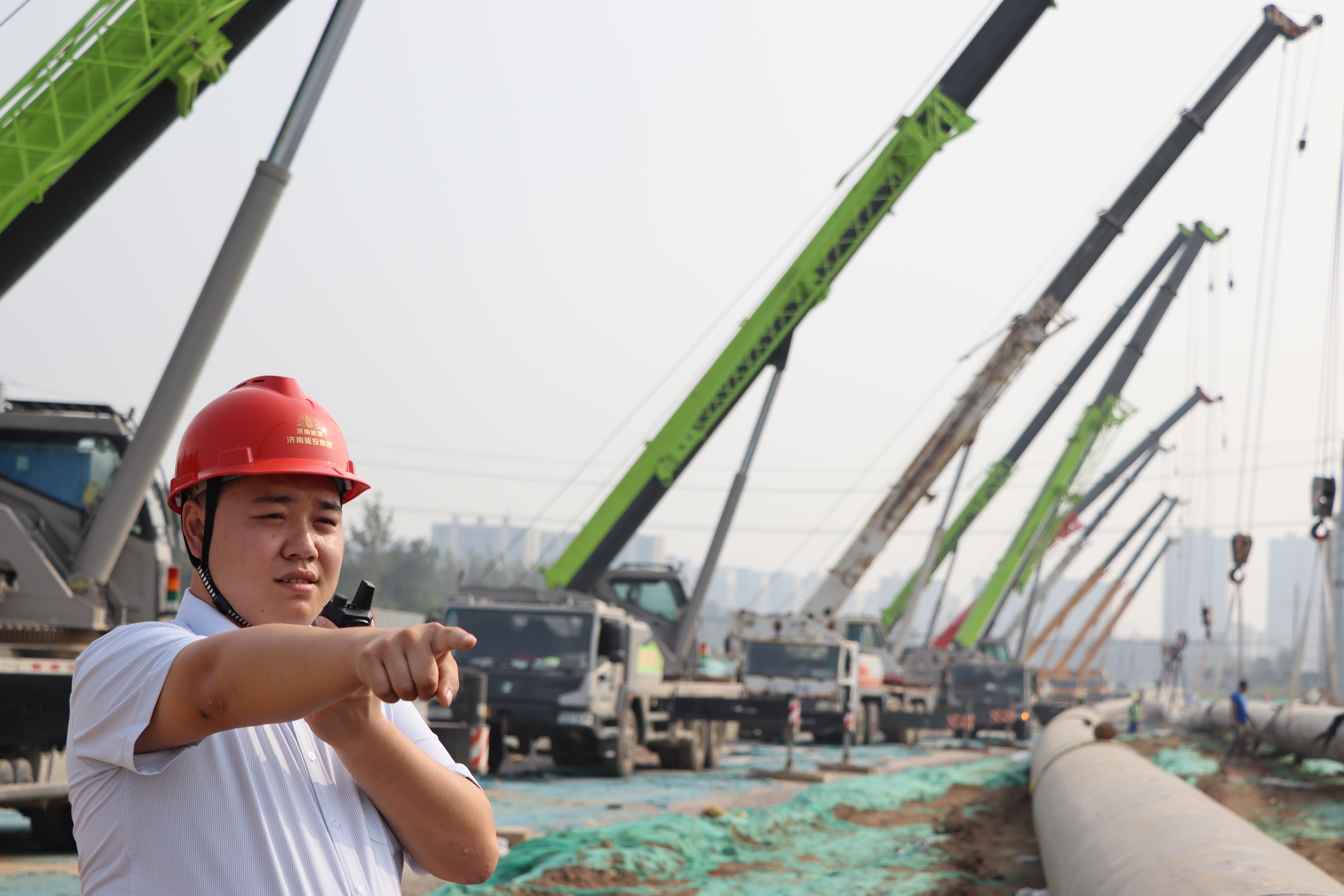 在商西路供热管网项目施工现场,一排排吊车正在紧张作业。据了解,该项目主要解决张赵、窦何、苏庞、孟于等四个安置区居民冬季采暖问题,现场因涉及绿化保护,需进行过河拉管施工,拉管总长度为540米,涉及管道管径为DN700,施工难度较大。10月2日,济南市商河恒泰供热有限公司经多方协调,紧急调用19辆吊车对540余米供热管道进行吊管拉管作业,期间将使用对讲机统一调度,周密配合,确保工期按时完成,保障采暖季居民的正常用热。