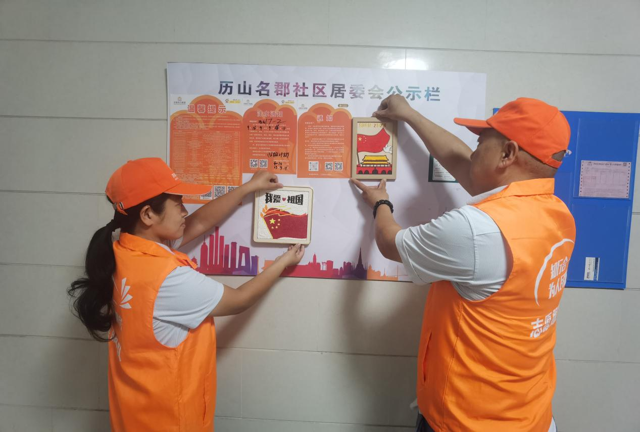 为了更好的服务群众,提供贴心的管家服务,和弘公司党员团员志愿者们带着制作的国庆纸浆画走进社区,在小区楼前公示栏上张贴,为用户营造浓浓节日氛围。