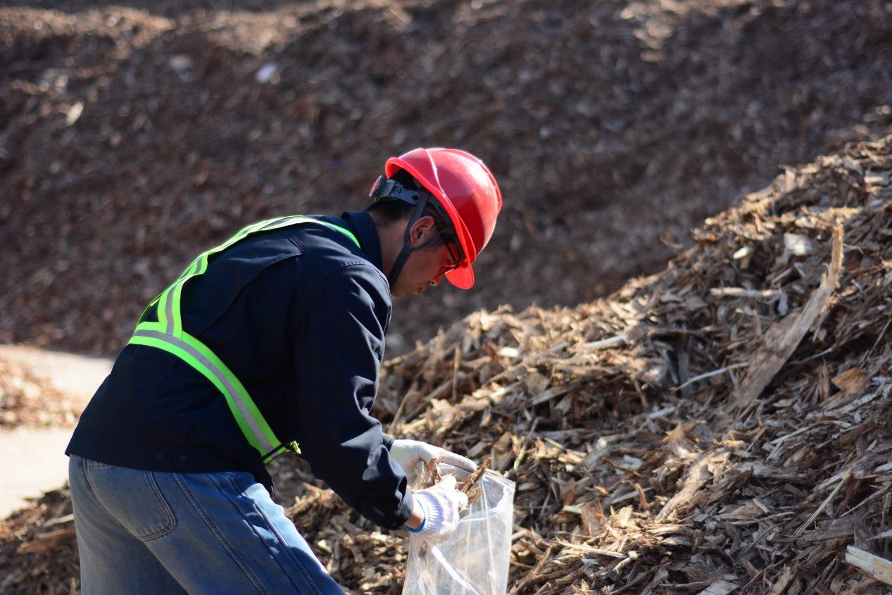 料场的另一边,质检员正对刚入场的秸秆进行取样。这些取样的燃料稍后要被送入化验室,那里有专业的化验人员对样品进行质量检验,经过水分、灰分等指标检测,确保入库的燃料都是符合要求的。为提高燃料燃烧效率,降低单耗,燃料晾晒后将按照科学的掺配比例进行掺配,保障安全生产更具经济性。